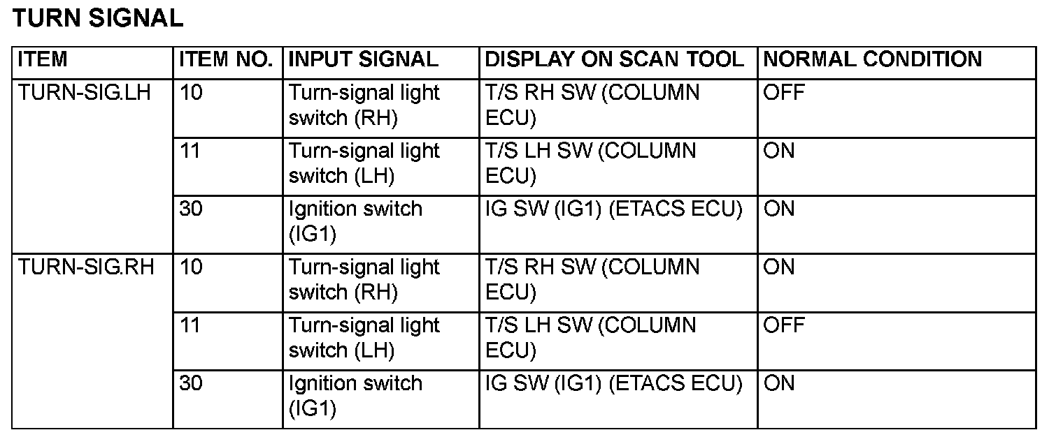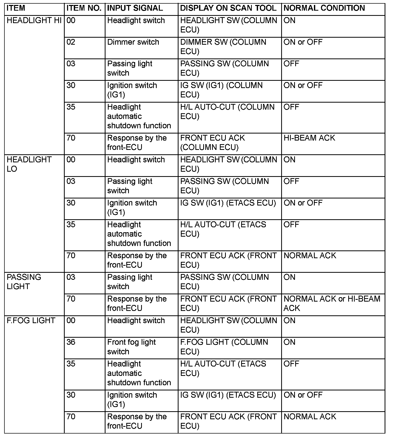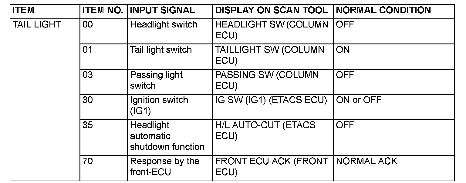 NOTE: When checking the input signals (off, tail, low-beam or high-beam), turn the ignition switch to the "ON" position in order to disable the headlight automatic shutdown function. However, the headlight operation does not depend on the ignition switch positions, the scan tool MB991958 (MUT-III Sub Assembly) does not display the title "IGNITION SWITCH".