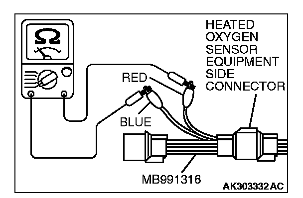 2. Make sure that there is continuity [4.5 - 8.0 ohms at 20 °C (68 °F)] between terminal No. 1 (red clip) and terminal No. 3 (blue clip) on the heated oxygen sensor connector.