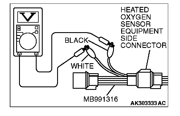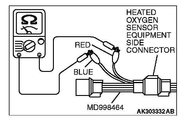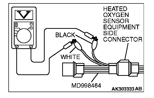 1. Disconnect the heated oxygen sensor connector and connect special tool MD998464 to the connector on the heated oxygen sensor side.
