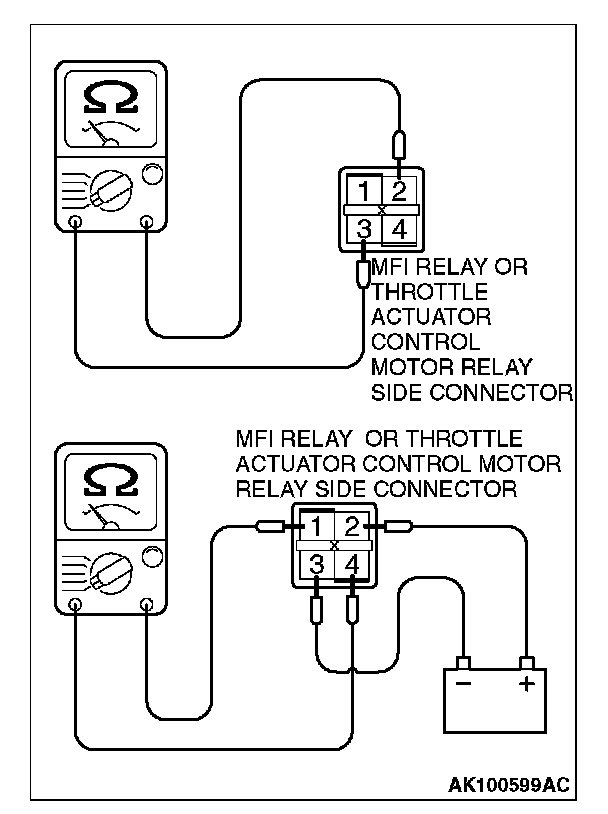 MULTIPORT FUEL INJECTION (MFI) RELAY AND THROTTLE ACTUATOR CONTROL MOTOR RELAY CONTINUITY CHECKInspect the MFI relay and throttle actuator control motor relay for continuity in accordance with the chart as shown.