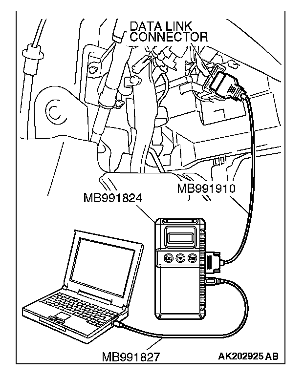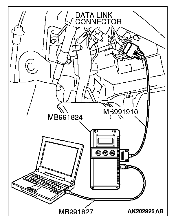 CAUTION: To prevent damage to scan tool MB991958, always turn the ignition switch to the "LOCK" (OFF) position before connecting or disconnecting scan tool MB991958.