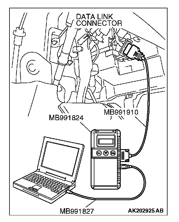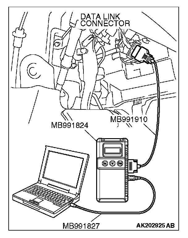 CAUTION: To prevent damage to scan tool MB991958, always turn the ignition switch to the "LOCK" (OFF) position before connecting or disconnecting scan tool MB991958.