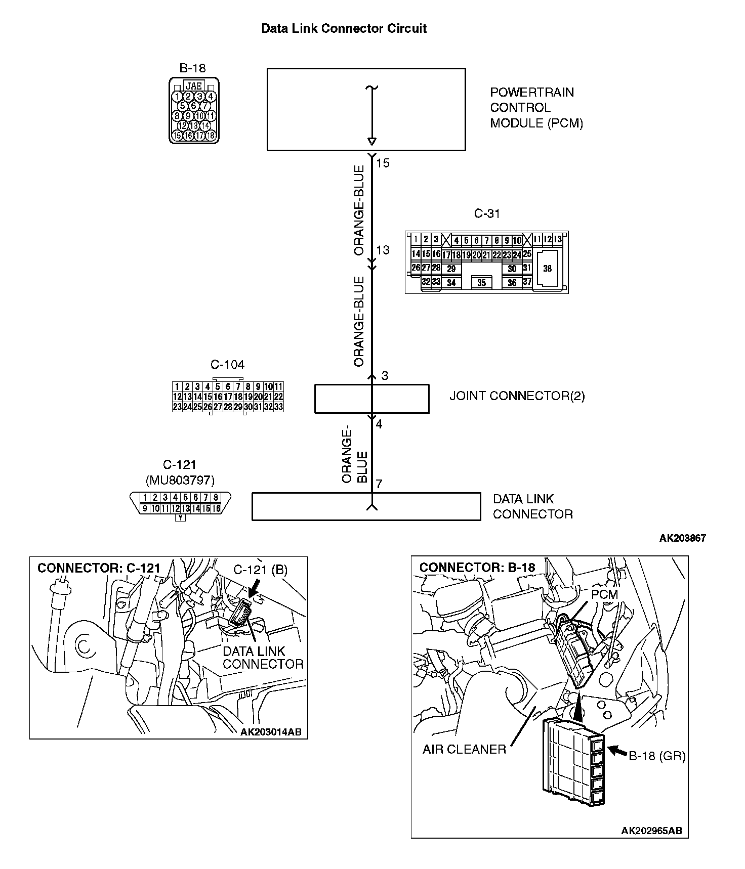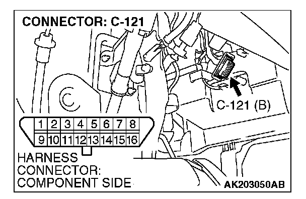 STEP 2. Check for open circuit, short circuit to ground and harness damage between data link connector C-121 (terminal No. 7) and PCM connector B-18 (terminal No. 15).