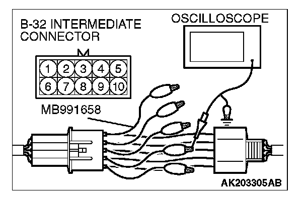 2. Connect the oscilloscope probe to each intermediate connector B-32 terminal to analyze each cylinder: