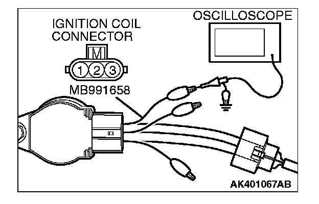 1. Disconnect the ignition coil connector, and connect test harness special tool (MB991658) between the separated connector. (All terminals should be connected.)