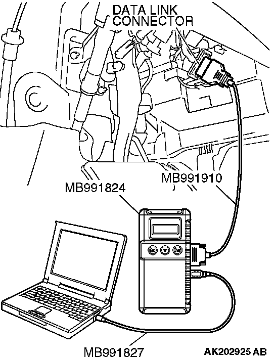 CAUTION: To prevent damage to scan tool MB991958, always turn the ignition switch to "LOCK" (OFF) position before connecting or disconnecting scan tool MB991958.