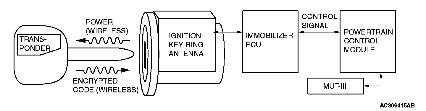 The immobilizer system consists of the ignition key, the key ring antenna, immobilizer-ECU, and the PCM. The ignition key has a built-in transponder. The key ring antenna is installed on the steering lock cylinder. Only the registered ignition key permits the engine to start, therefore, the engine can never be started by means of a forged key or by connecting the ignition wiring directly. The system is significantly safe and reliable against theft. In addition, the driver has only to turn the ignition switch to the "ON" position to activate the immobilizer system. If the requirements for starting the engine are not satisfied, the engine will be immobilized. If a registered ignition key is lost, all your ignition keys need to be registered again using scan tool MB991958 (MUT-III Sub Assembly) to ensure security (Refer to Antitheft and Alarm Systems/Service and Repair/How To Register Encrypted Code). An additional ignition key can be registered as follows (only if no ignition keys are lost):