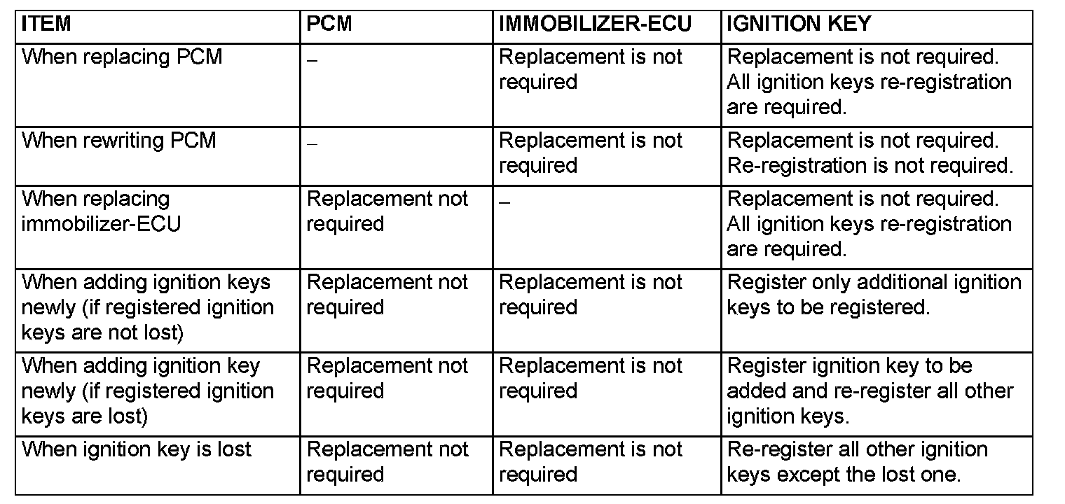 To replace immobilizer system related parts, refer to the table. When the ignition key is re-registered with scan tool MB991958, the originally registered ignition key registration information will be lost.