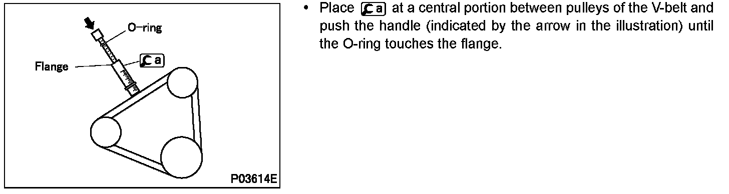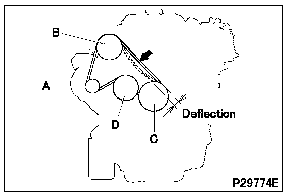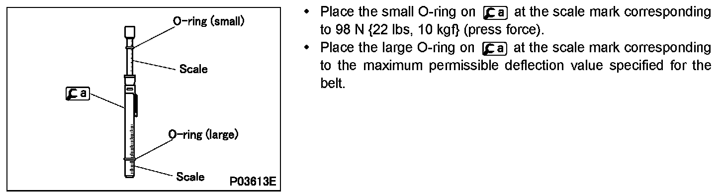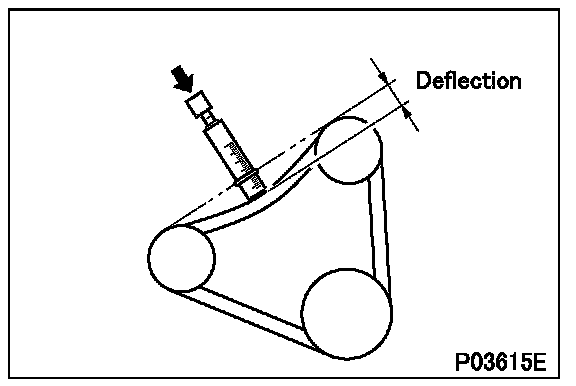 - Press each V-belt at a central portion between pulleys with a force of approximately 98 N {22 lbs, 10 kgf} as shown in the illustration and measure the amount of deflection of the belt.