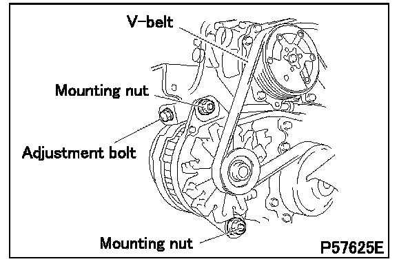 - Loosen the alternator mounting nuts (2 locations) and adjust the tension of the V-belt by tightening or loosening the adjustment bolt.