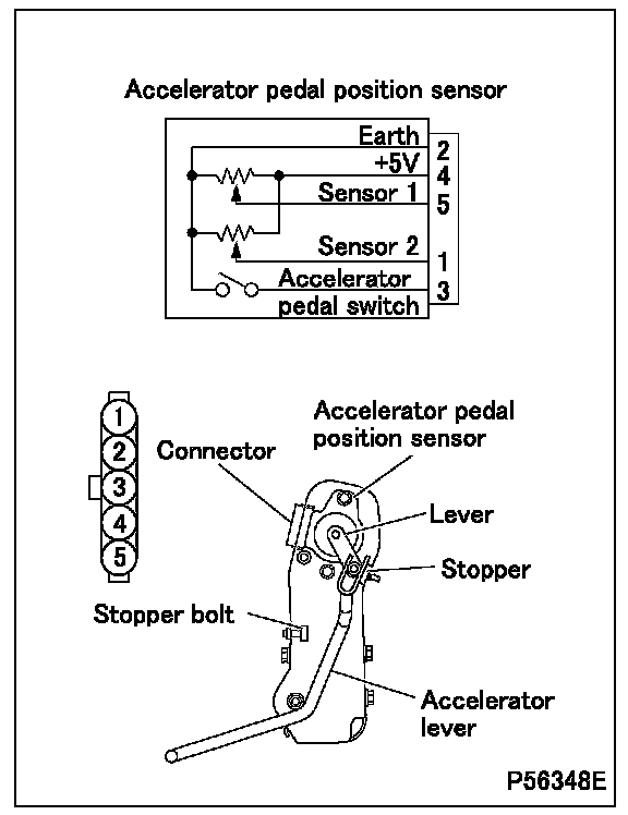 - Measure the output voltage at terminals 2 and 5 (sensor 1) and the output voltage at terminals 1 and 2 (sensor 2) with the accelerator lever in each specified position.