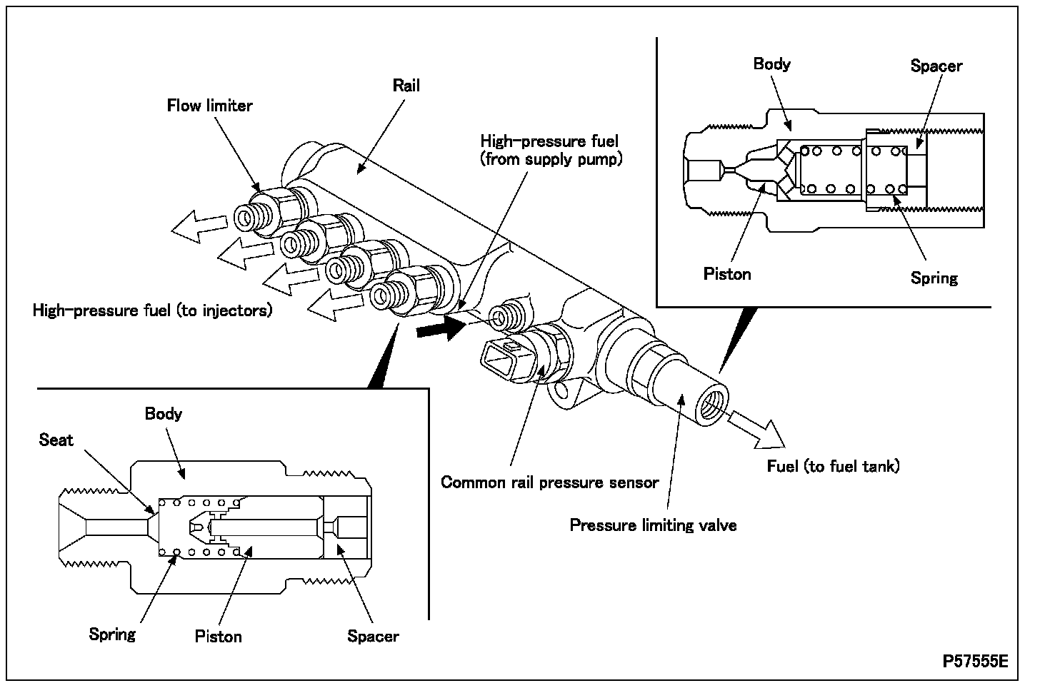 - Each flow limiter prevents an abnormal outflow of fuel. It does so by blocking the fuel passage in the event of fuel leakage from the injection pipe or excessive injection of fuel from the injector.