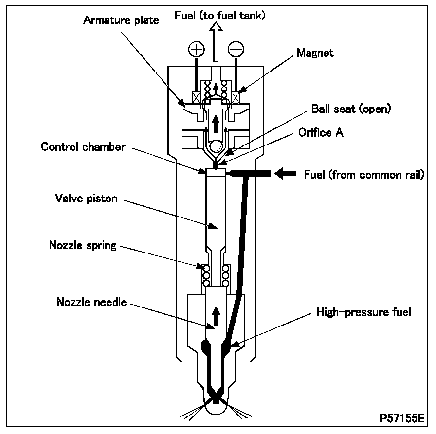 - Fuel in the control chamber passes through the ball seat and orifice A and flows to the fuel tank.