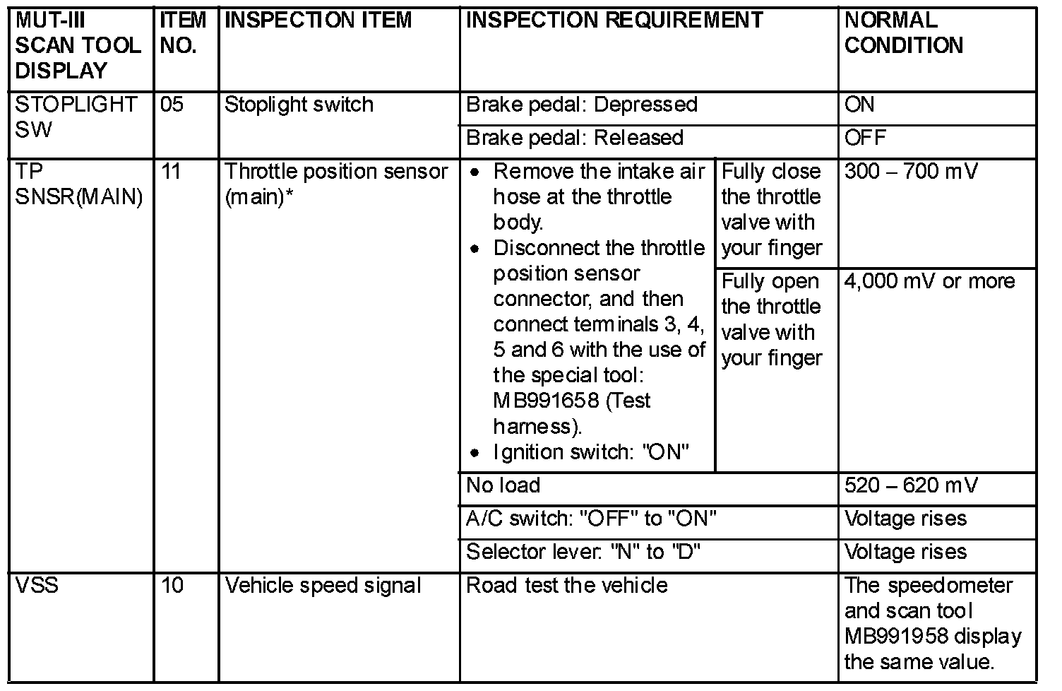 NOTE: *:After the inspection is completed, disconnect the throttle position sensor connector, and then delete the diagnostic trouble code using use of scan tool MB991958.