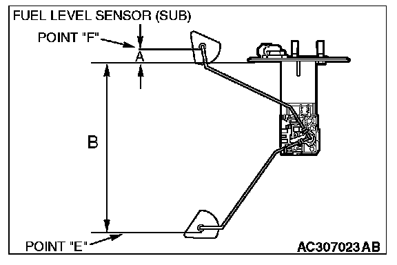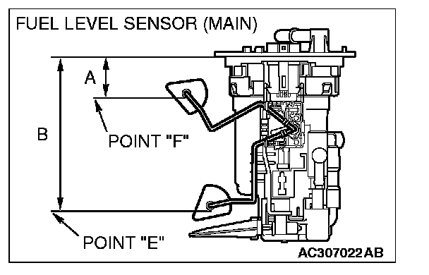 1. Move the float and measure height A at point "F" (highest) and B at point "E" (lowest).