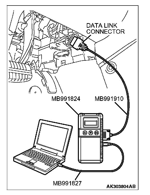 CAUTION: To prevent damage to scan tool MB991958, always turn the ignition switch to the "LOCK" (OFF) position before connecting or disconnecting scan tool MB991958.