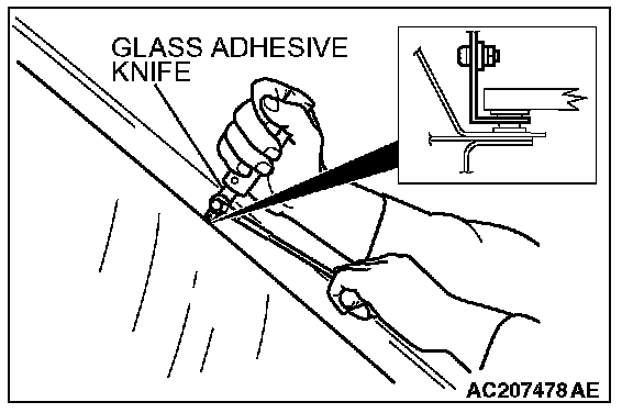 CAUTION: Inserting the glass adhesive knife too deeply into windshield adhesive may damage windshield.