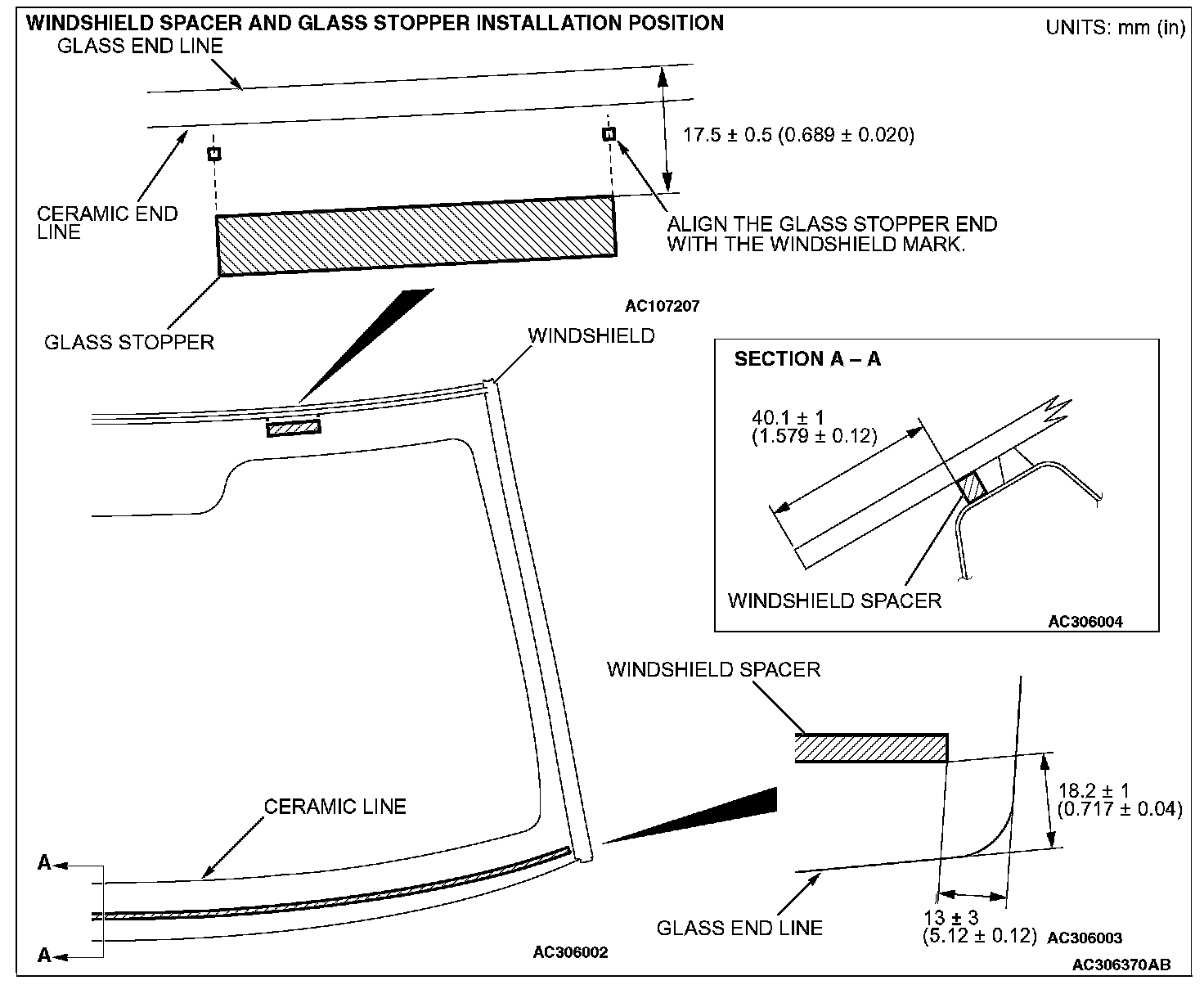 2. Install the windshield spacer and glass stoppers to the specified positions so that there are no adrift or warped surfaces inside the windshield.