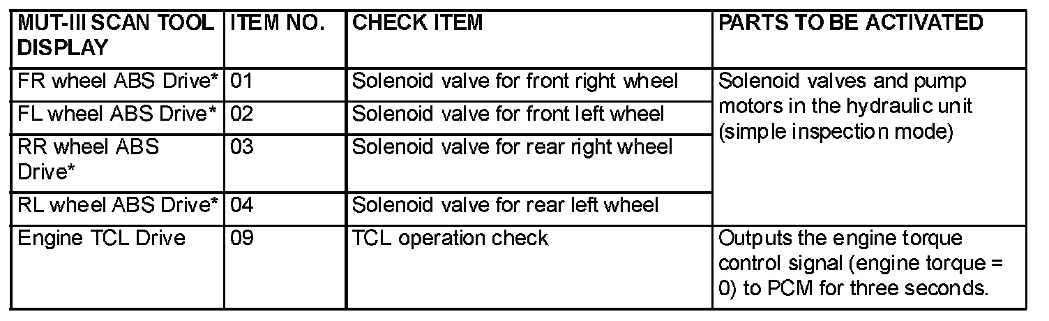 NOTE: Since the TCL is controlled with the same ABS/TCL-ECU used to control the ABS, the FR, FL, RR or RL Wheel ABS Drive testing items (No.01 to 04) used only for the ABS also appear.