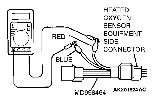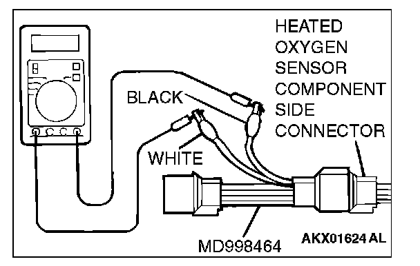 1. Disconnect the heated oxygen sensor connector and connect special tool MD998464 to the connector on the heated oxygen sensor side.