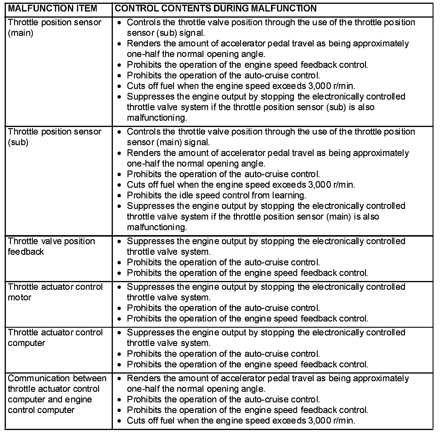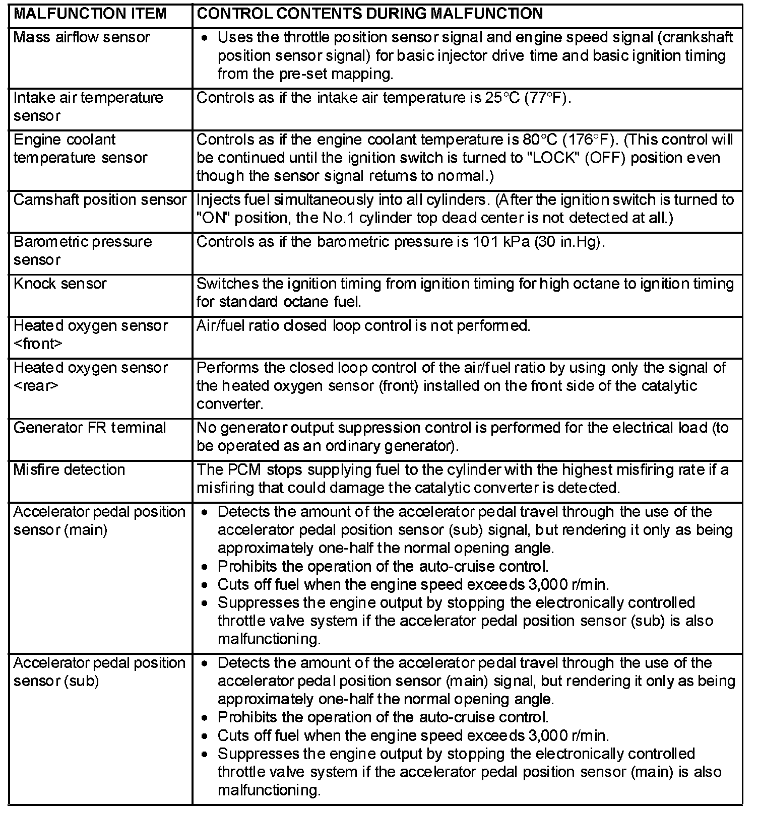 When the main sensor malfunctions are detected by the diagnostic test mode, the vehicle is controlled by means of the defaults.