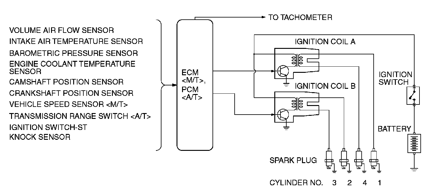 This system is provided with two ignition coils (A and B) with built-in ignition power transistors for the number 1 and number 4 cylinders, and number 2 and number 3 cylinders respectively.
