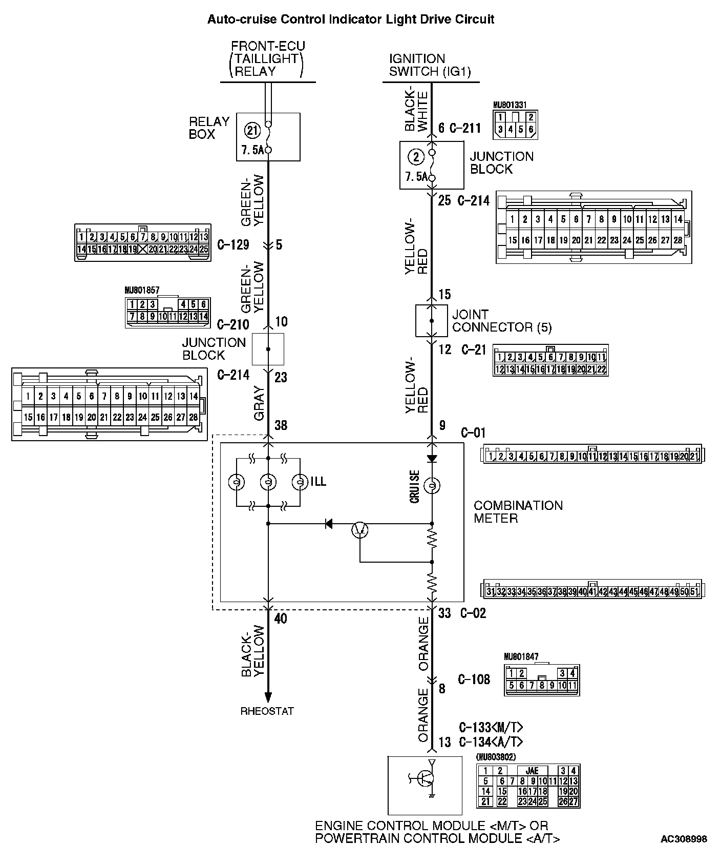 STEP 3. Check the harness wire between combination meter connector C-01 terminal 9 and junction block connector C-214 terminal 25 for damage.