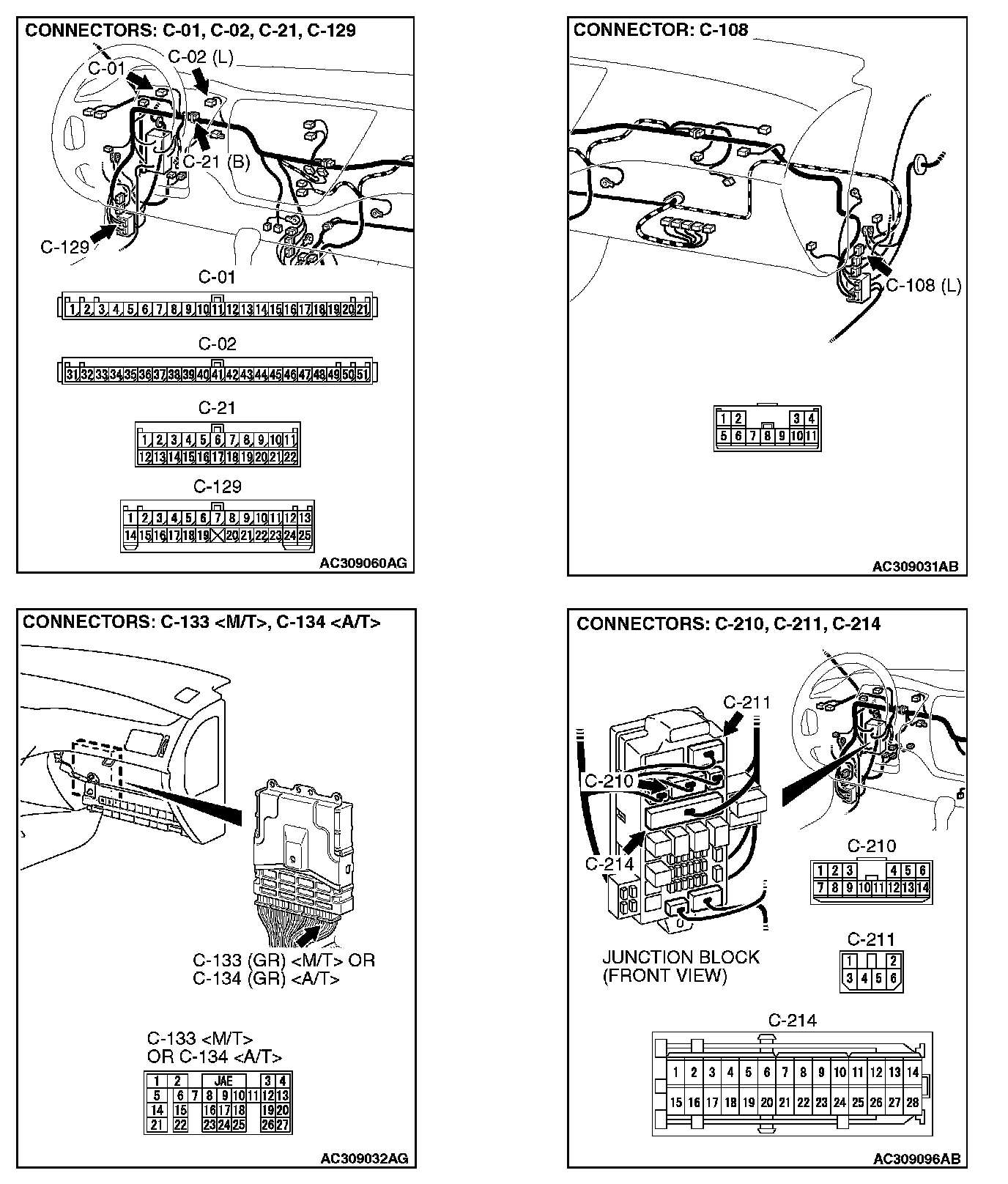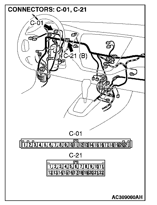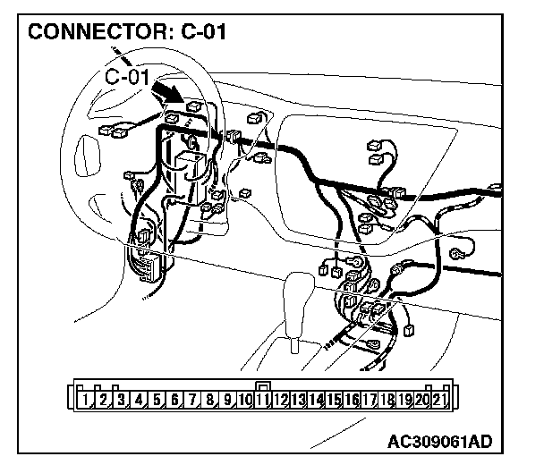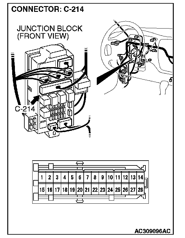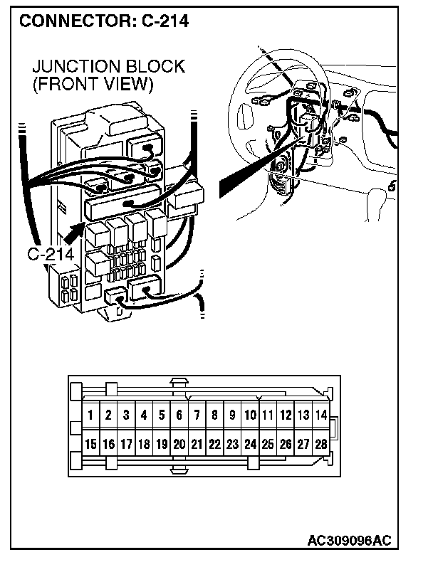 STEP 2. Check combination meter connector C-01, joint connector 5. C-21 and junction block connector C-214 for loose, corroded or damaged terminals, or terminals pushed back in the connector.