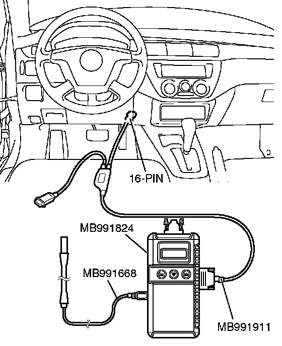 CAUTION: To prevent damage to special tool MB991824, always turn the ignition switch to the LOCK (OFF) position before connecting or disconnecting special tool MB991824.