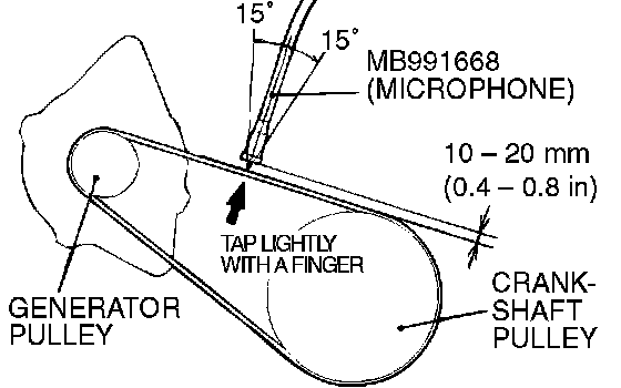 5. Hold special tool MB991668 (microphone) near the center of the drive belt between the pulleys (at the place indicated by the arrow), about 10 - 20 mm (0.4 - 0.8 inch) away from the rear surface of the belt and perpendicular to the belt (within an angle of ± 15 degree angle).