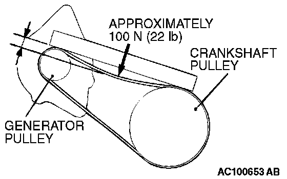 Apply approximately 100 N (22 pound) of force to the middle of the drive belt between the pulleys (at the place indicated by the arrow) and check that the amount of deflection is within the standard value.