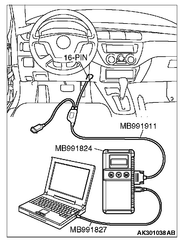 CAUTION: To prevent damage to scan tool MB991958, always turn the ignition switch to the "LOCK" (OFF) position before connecting or disconnecting scan tool MB991958.