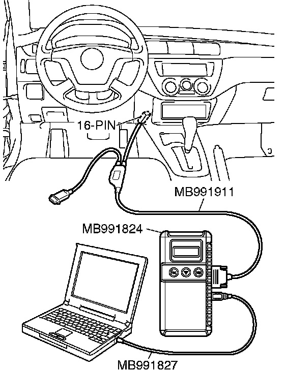 CAUTION: To prevent damage to scan tool MB991958, always turn the ignition switch to the "LOCK" (OFF) position before connecting or disconnecting scan tool MB991958.