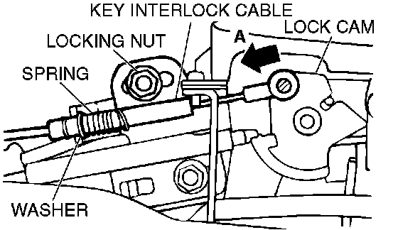 4. Lightly push the key interlock cable into the key interlock cable housing toward the arrow (A) direction until the cable movement stops and the cable end eye is aligned with the shaft on the lock cam. Tighten the locking nut. Snap the cable end eye onto the shaft of the lock cam.