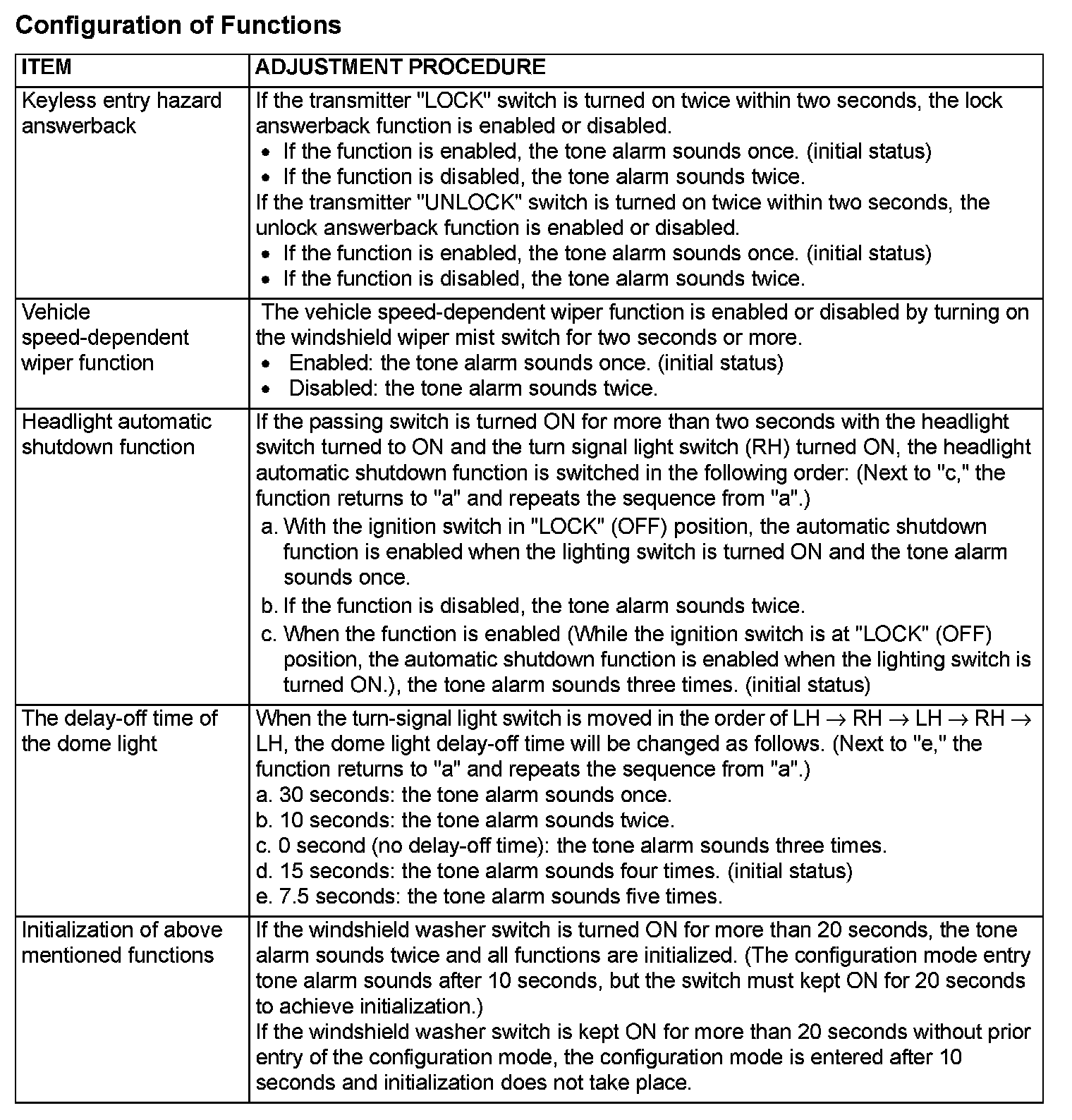 The following functions can be enabled or disabled by operating input switches in a special manner. This set mode is stored after the battery is disconnected.