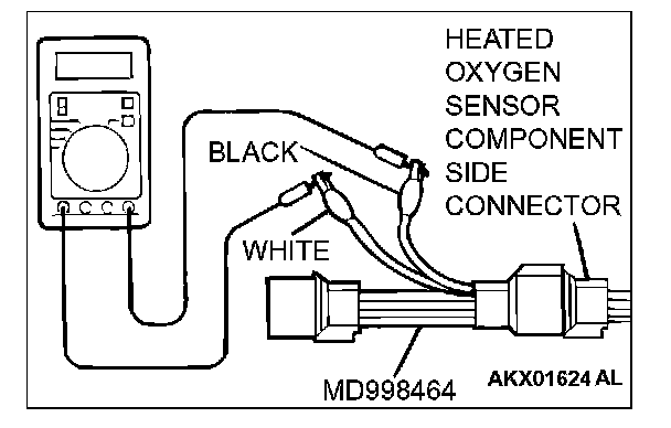 1. Disconnect the heated oxygen sensor connector and connect special tool MD998464 to the connector on the heated oxygen sensor side.