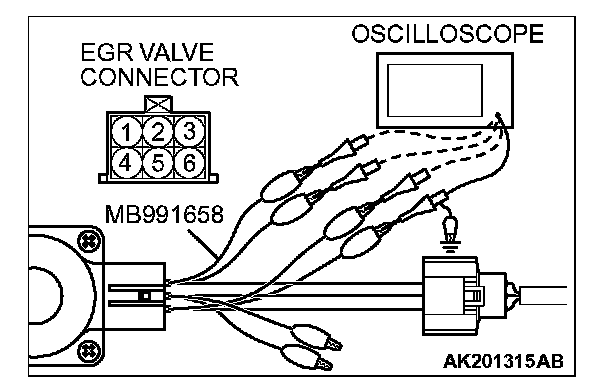2. Connect the oscilloscope probe to the EGR valve connector terminal No.1, terminal No.3, terminal No.4, No. terminal 6 respectively.