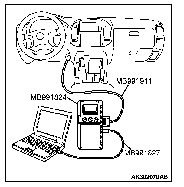 CAUTION: To prevent damage to scan tool MB991958, always turn the ignition switch to the "LOCK" (OFF) position before connecting or disconnecting scan tool MB991958.