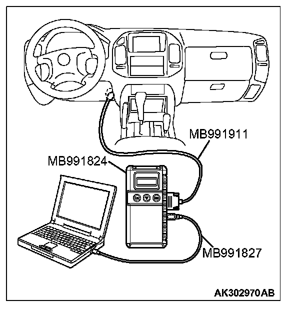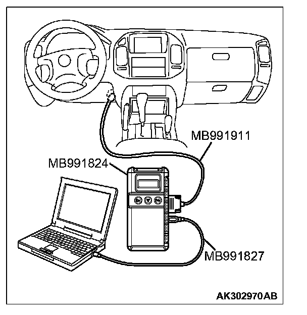 CAUTION: To prevent damage to scan tool MB991958, always turn the ignition switch to the "LOCK" (OFF) position before connecting or disconnecting scan tool MB991958.