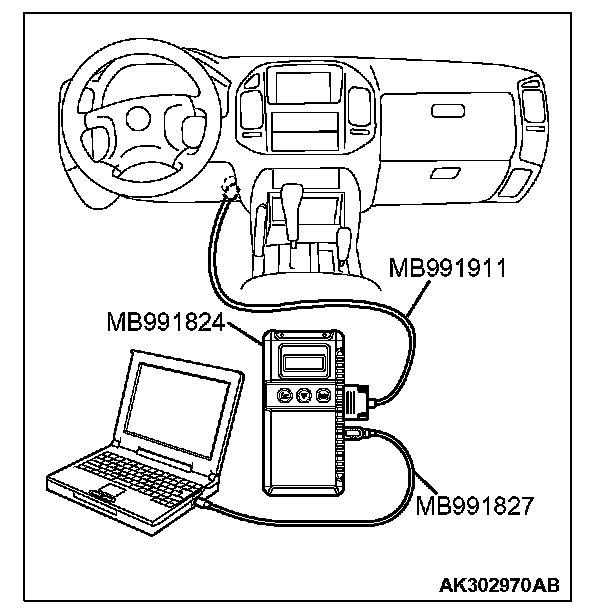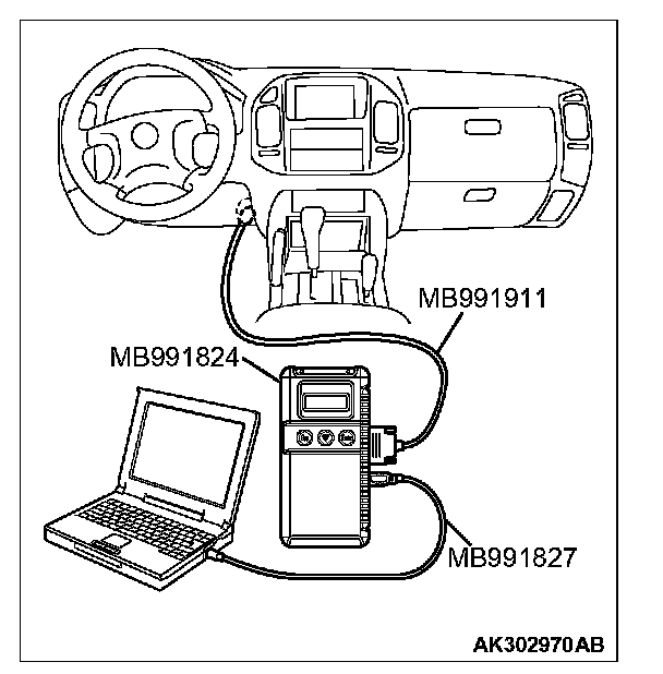 CAUTION: To prevent damage to scan tool MB991958, always turn the ignition switch to the "LOCK" (OFF) position before connecting or disconnecting scan tool MB991958.