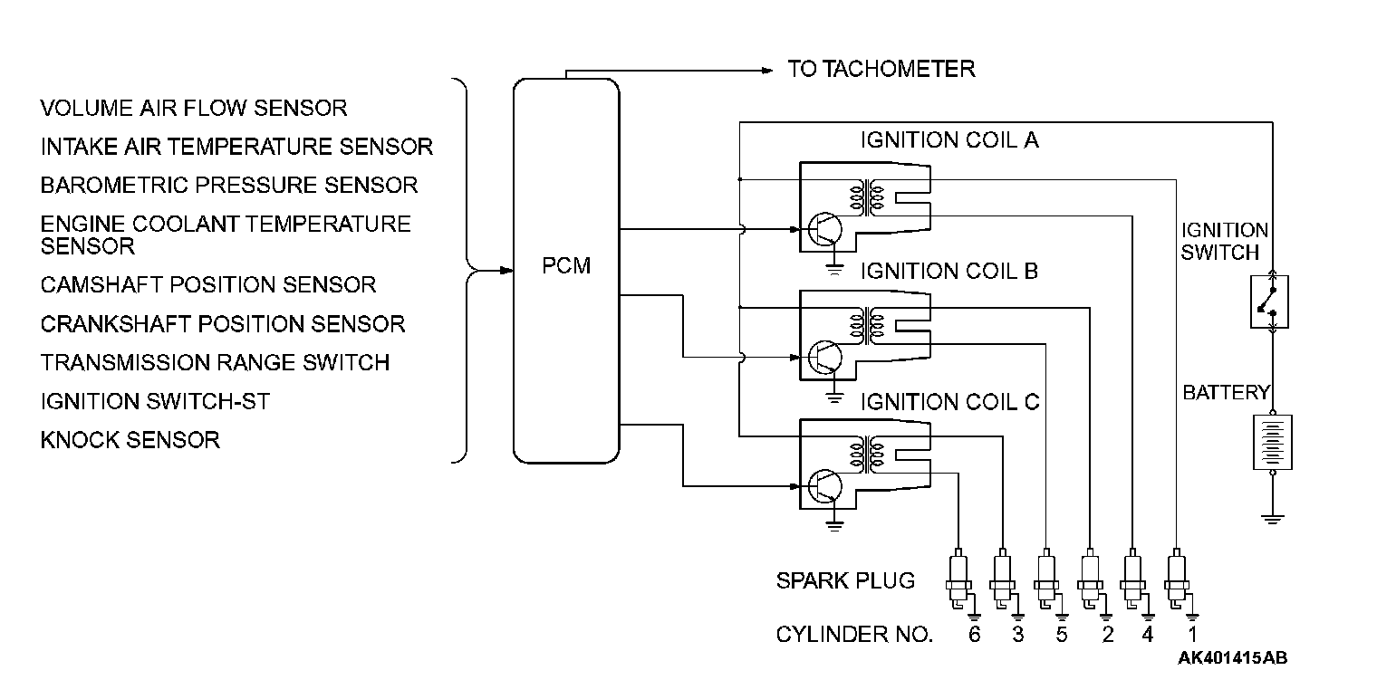 This system is provided with three ignition coils (A, B and C) with built-in three ignition power transistors for the number 1 and number 4 cylinders, number 2 and number 5 cylinders and number 3 and number 6 cylinders respectively.