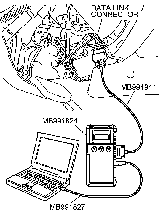 CAUTION: To prevent damage to scan tool MB991958, always turn the ignition switch to the "LOCK" (OFF) position before connecting or disconnecting scan tool MB991958.