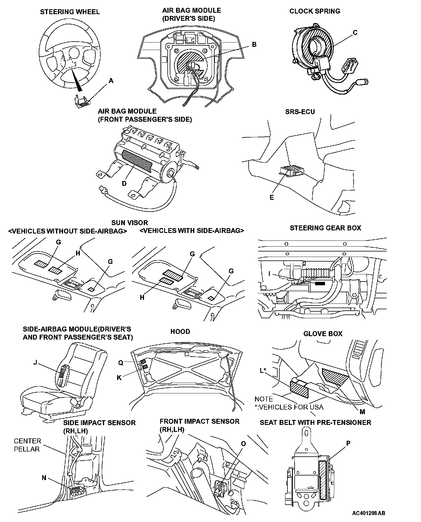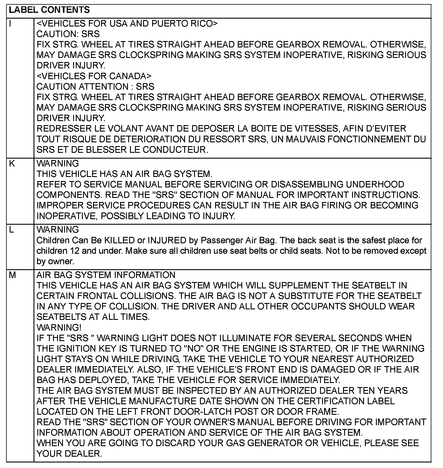 WARNING/CAUTION LABELSA number of caution labels related to the SRS are found in the vehicle, as shown in the illustration. Follow label instructions when servicing SRS. The label L is not to be removed except by owner. If the other labels are dirty or damaged, replace them.