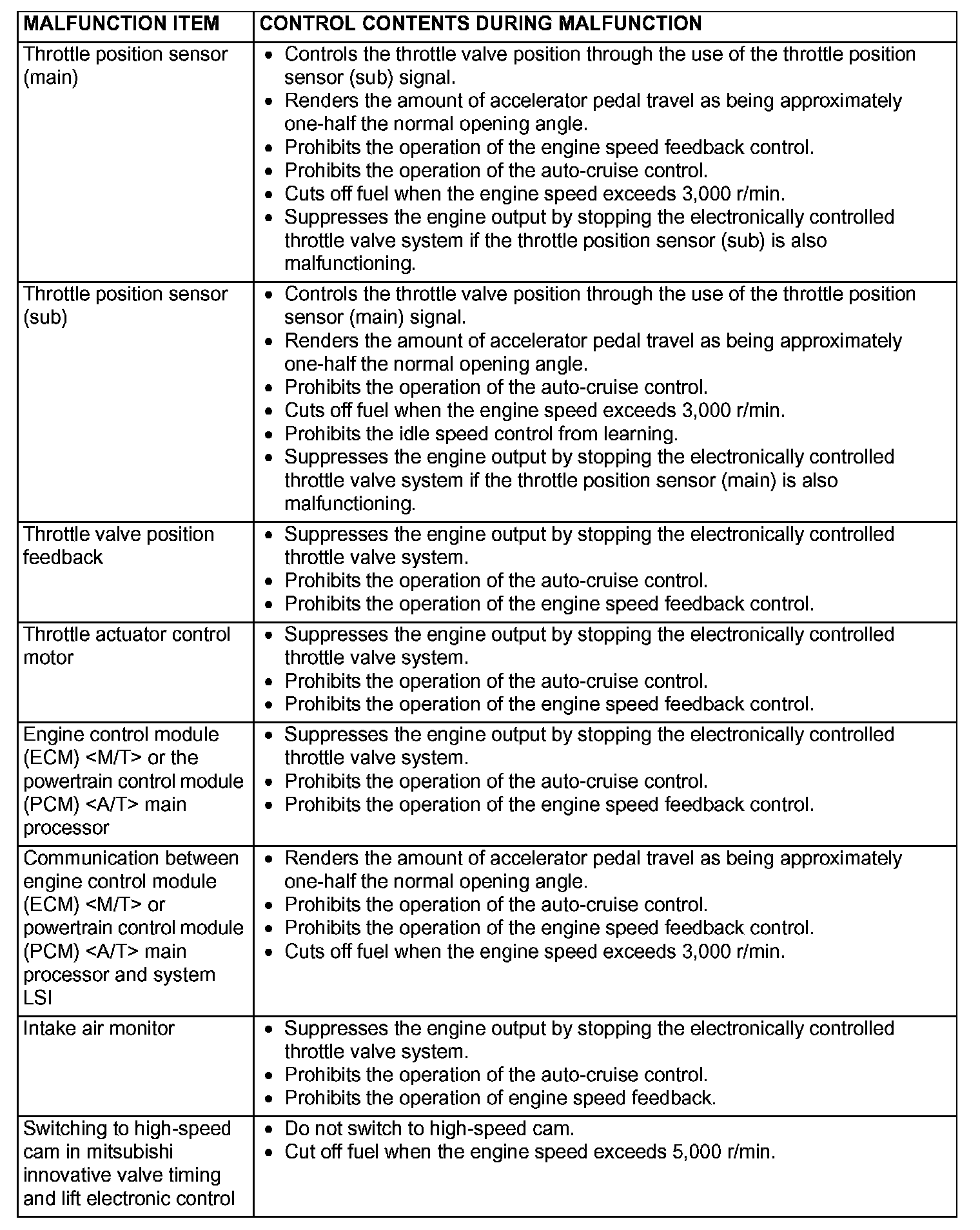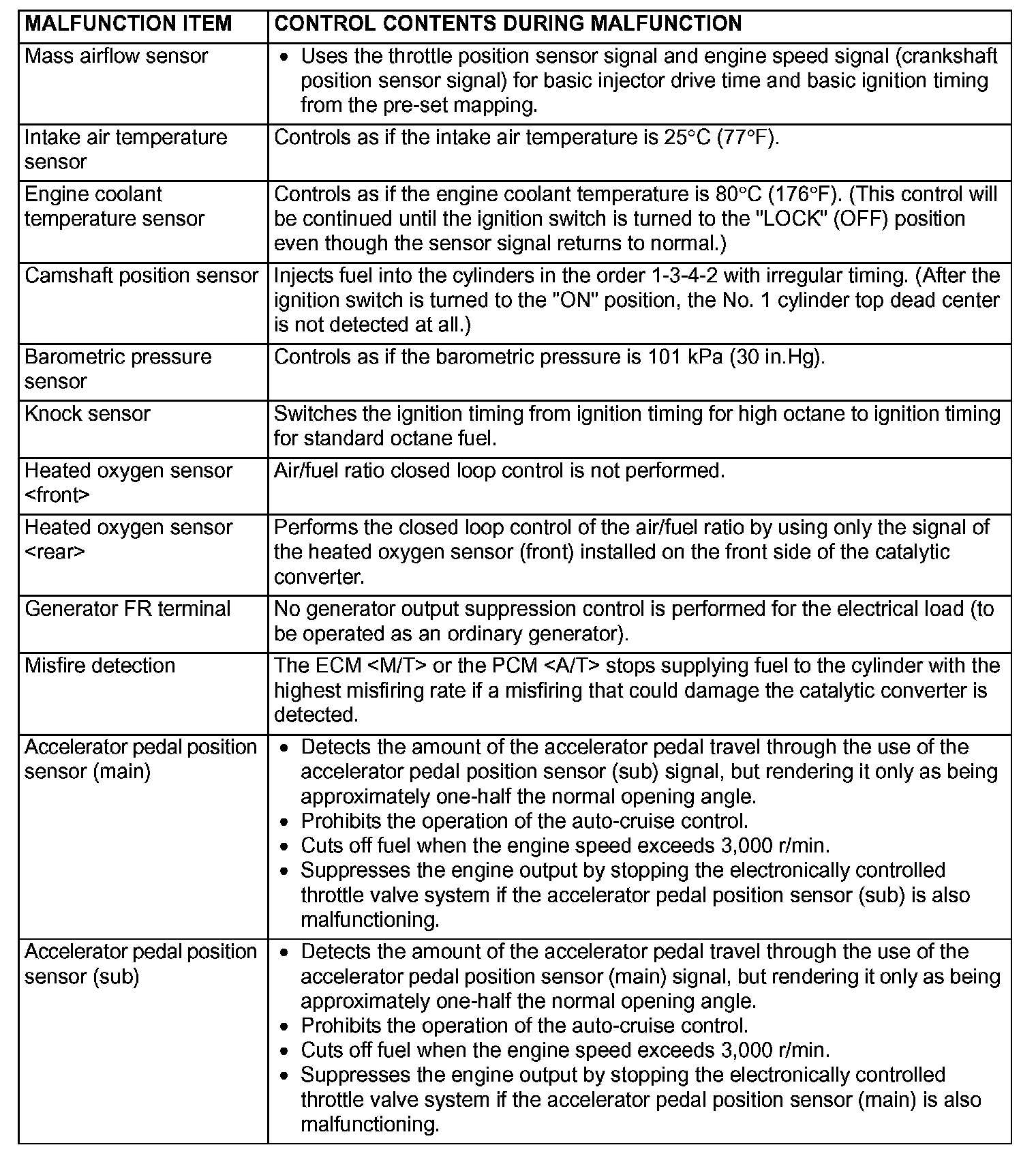 When the main sensor malfunctions are detected by the diagnostic test mode, the vehicle is controlled by means of the defaults.