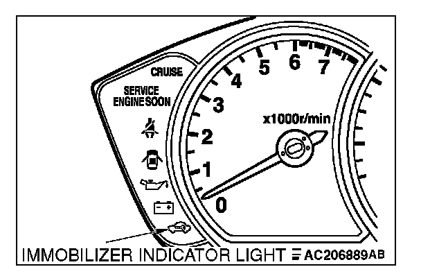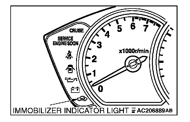 If an attempt is made to start the engine with an unregistered ignition key, cranking occurs, but fuel supply is cut off to disable the engine. In approx. 10 seconds, the immobilizer indicator will blink for approx. 30 seconds.