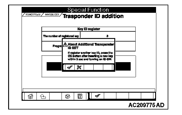 6. If an additional registration is made successfully, the screen will ask if another key is registered or not. If the third ignition key is registered, remove the key, which has been registered. Then insert the third key within five seconds, and then turn it to the ON position.