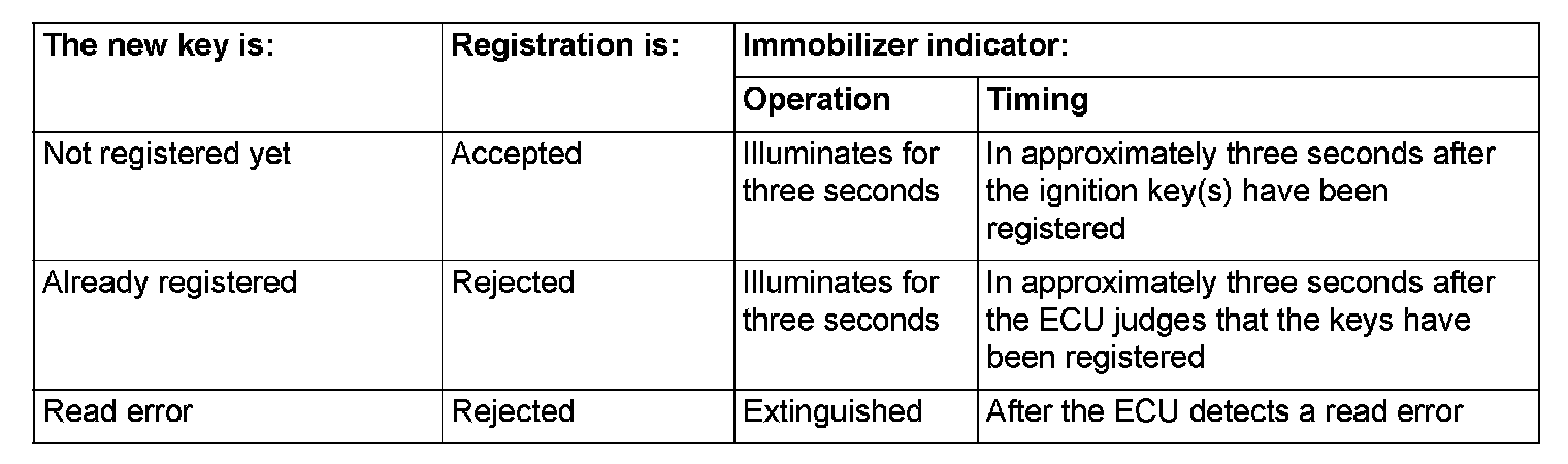 7. The immobilizer-ECU identifies the new key to accept or reject it, and operates the immobilizer indicator (See the table).