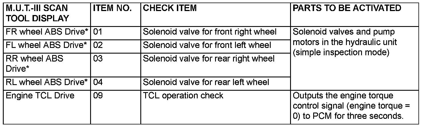 NOTE: Since the TCL is controlled with the same ABS/TCL-ECU or TCL/ASC-ECU used to control the ABS, the FR, FL, RR or RL Wheel ABS Drive testing items (No.01 to 04) used only for the ABS also appear.