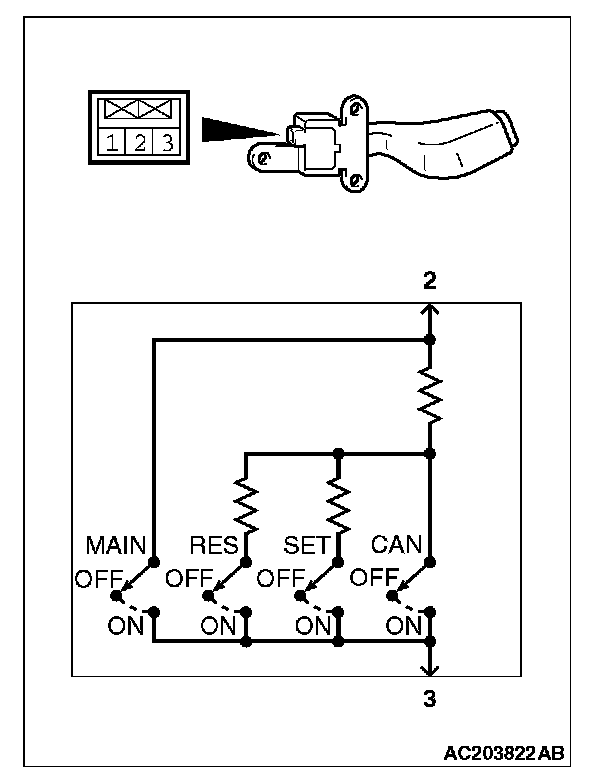 2. Measure the resistance between terminal 2 and terminal 3 when each of the "COAST/SET", "ACC/RES", "CANCEL" and "CRUISE" (MAIN) switches is pressed. If the values measured at the time correspond to those in the table, the resistance values are correct.