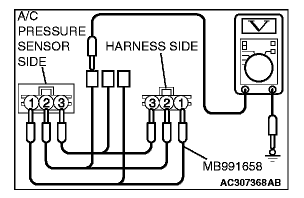 2. Disconnect the A/C pressure sensor connector and connect special tool MB991658 as shown in the illustration.